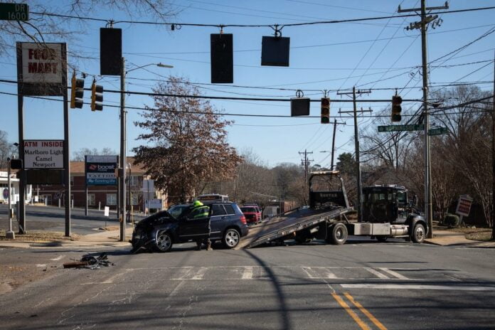 A automobile accident is cleared at an intersection with out energy at cease lights in Charlotte, North Carolina on December 24, 2022. LOGAN CYRUS / AFP by way of Getty Pictures