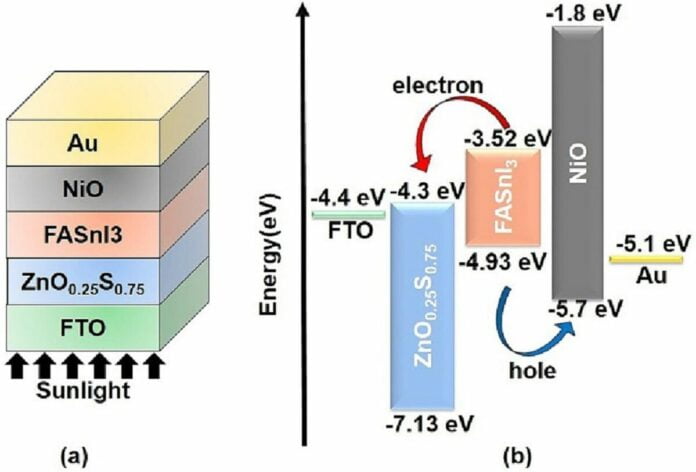 They constructed the cell with a fluorine-doped tin oxide (TFO) substrate, a zinc oxide (ZnO) electron transport layer, a FASnI3 absorber, a nickel oxide (NiO) gap transport layer (HTL), and a gold (Au) steel contact. .