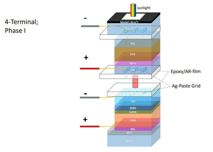 US researchers designed the underside cell with an indium zinc oxide (IZO) clear conductive oxide movie, a tin(IV) oxide (SnO2) buffer layer, a perovskite layer, and a layer on methyl-substituted carbazole (Me-4PACz) as a hole-transport layer. For the highest cell, they used an indium tin oxide (ITO) substrate, a cadmium sulfide (Cds) layer, and a CIGS absorber.