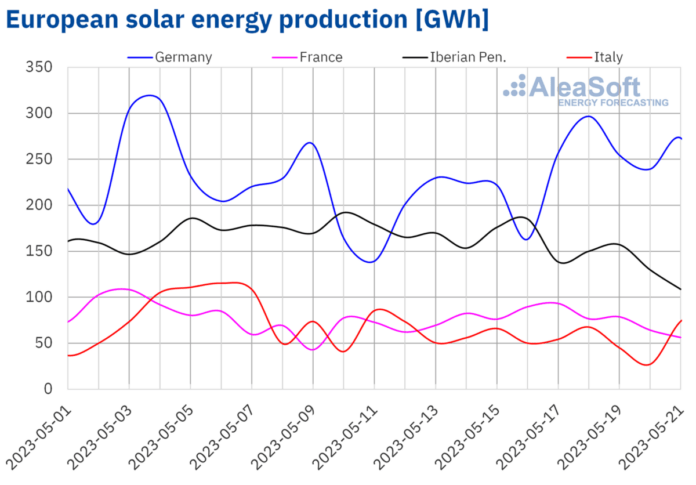 Within the week of Might 15, the 20th week of the 12 months, photo voltaic photovoltaic vitality manufacturing reached a report worth within the Iberian Peninsula, with a complete manufacturing of 862 GWh in Spain and 81 GWh in Portugal, in comparison with the twentieth that week. within the final 5 years. Nevertheless, in comparison with final week, when historic information have been registered in these two markets, the manufacturing of photo voltaic vitality, together with the manufacturing of photo voltaic thermoelectric vitality within the case of Spain, fell by 13% and 16% each. The identical development was noticed in Italy, with a lower of 11% in comparison with the week of Might 8. Within the remaining markets analyzed by AleaSoft Vitality Forecasting, A rise in photo voltaic vitality manufacturing of 12% and 17% was registered in France and Germany, respectively.