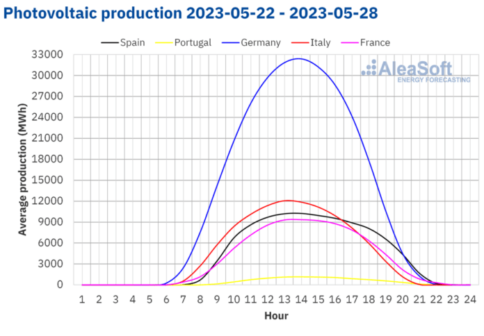 In comparison with the earlier week, the manufacturing of photo voltaic power elevated in three markets, the Italian market being the one with the most important improve, by 88%. Within the German and French markets, the manufacturing progress of this expertise is 16% and 10%, respectively. Then again, within the markets of Spain and Portugal, after data had been registered final week, the manufacturing of photo voltaic power decreased by 23% and 17%, respectively. For the week of Might 29, AleaSoft Vitality Forecasting’s photo voltaic power manufacturing forecasting exhibits that manufacturing will improve in Germany and Spain, however it could fall in Italy.