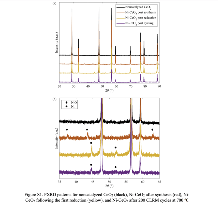 The usage of photo voltaic thermal power to drive the chemical looping reforming of methane (CLRM) is a promising option to effectively and selectively reform methane to supply syngas utilizing renewable power. On this work, the position of catalytically lively nickel in response kinetics, conversion, selectivity, and complete syngas manufacturing throughout CLRM of Ni-CeO2 investigated. By way of thermogravimetric evaluation (TGA), metallic nickel was proven to assist enhance the partial oxidation of methane (POM) response charges because of the decrease activation power response mechanism in all oxygen nonstoichiometries, in comparison with CeO2. For instance, the discount fee of Ni-CeO2 at 700 °C is akin to CeO2 at 900 °C, and no response was noticed for CeO2 at 700 °C. Moreover, prolonged biking with Ni-CeO2 confirmed steady response charges and yields throughout CLRM at 700 °C, and SCo remained above 0.98 in the course of the experiment. The usage of a bigger packed-bed reactor system, Ni-CeO2 additionally confirmed related methane conversion, syngas manufacturing and selectivity to CeO2however at a lot decrease working temperatures, ie, Q ≤ 800 °C. A better fee of coking was noticed through the POM of Ni-CeO2; nonetheless, all carbon was eliminated within the subsequent step and accumulation was not noticed throughout long-term biking. A parametric research of fuel velocity, temperature, and inlet partial stress of methane can also be offered to evaluate the impact of those working circumstances on the conversion, choice, and manufacturing of syngas. Notably, a tradeoff between the conversion and the quantity of syngas produced was noticed because the fuel velocity elevated; nonetheless, the conversion time response signifies that there’s a really perfect response cut-off time the place excessive syngas manufacturing charges might be concurrently achieved with near-complete methane conversion.