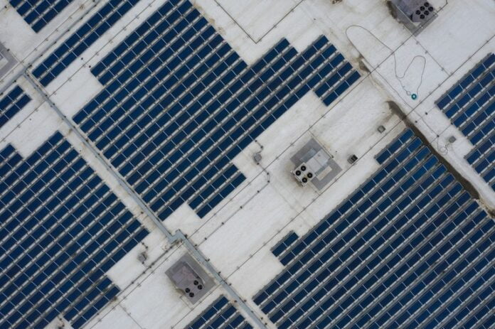 An array of photo voltaic panels on prime of an Ikea retailer in Carson, California.